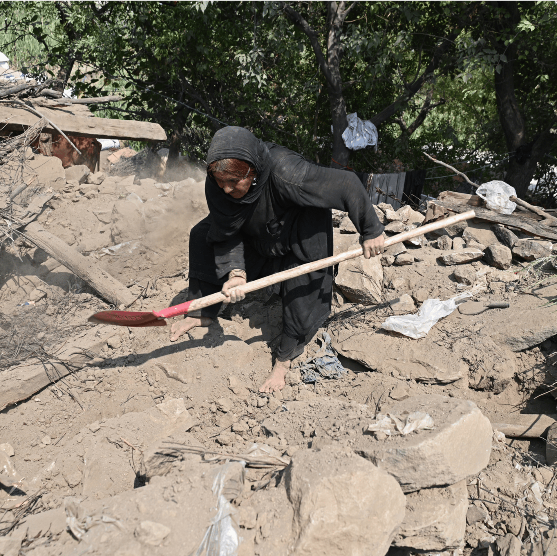 An Afghan woman shovelling rubble after last month’s earthquake. Wakil Kohsar/AFP/Getty