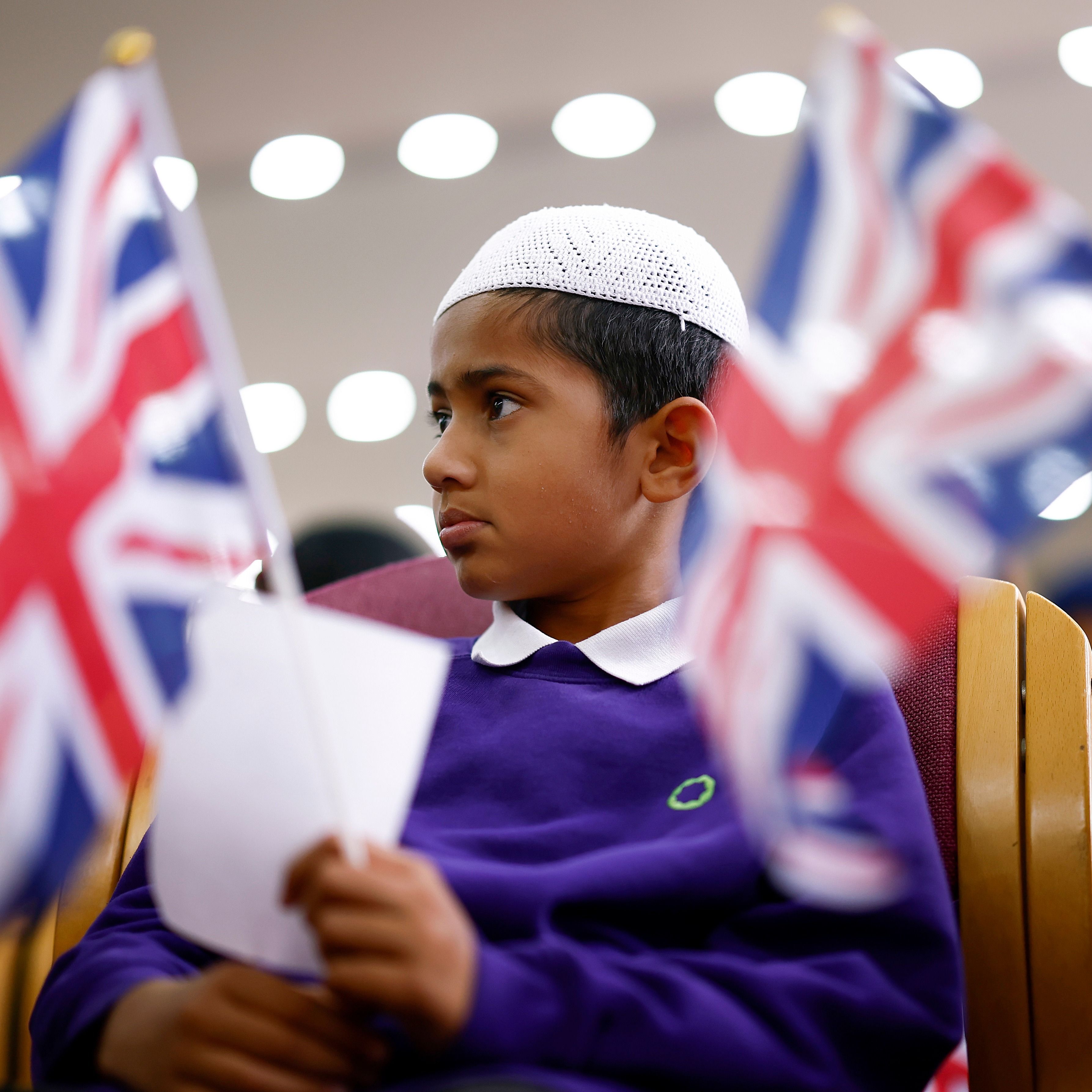 A boy paying tribute to the late Queen Elizabeth II at London Central Mosque in 2022. Jeff J Mitchell/Getty