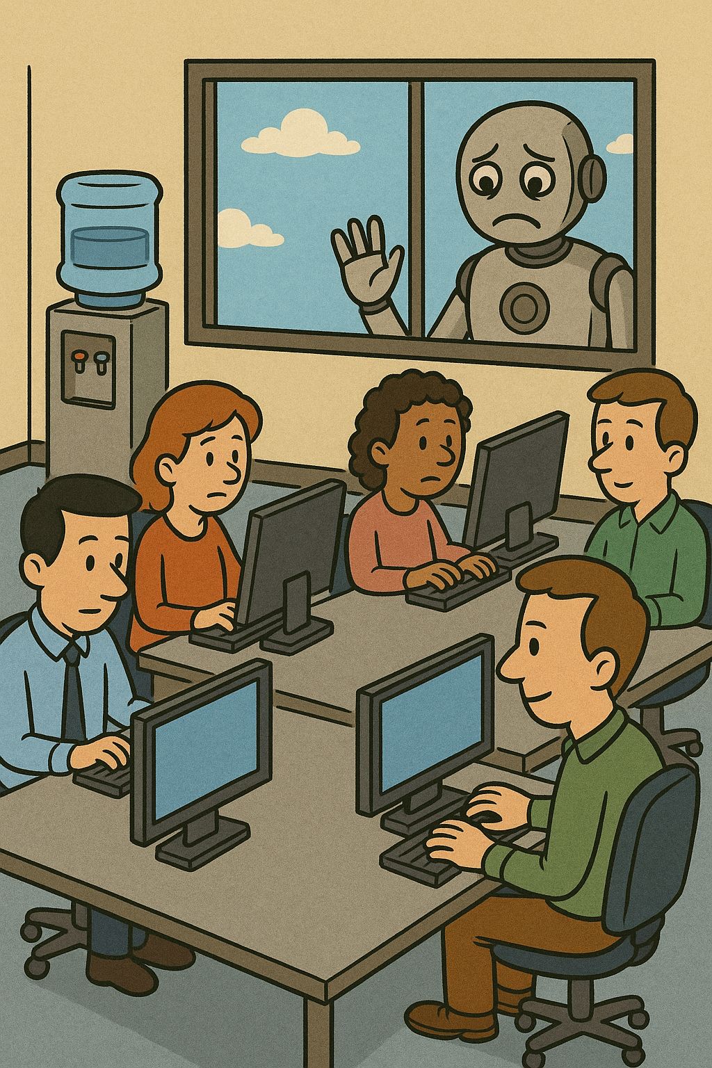 Office workers ignoring a robot, as imagined (shonkily) by ChatGPT