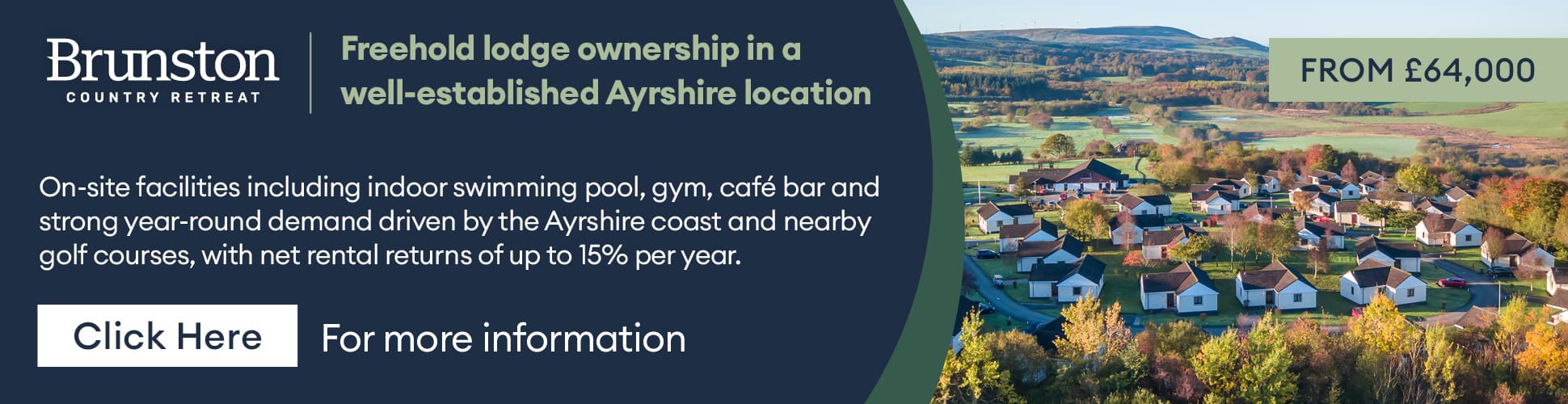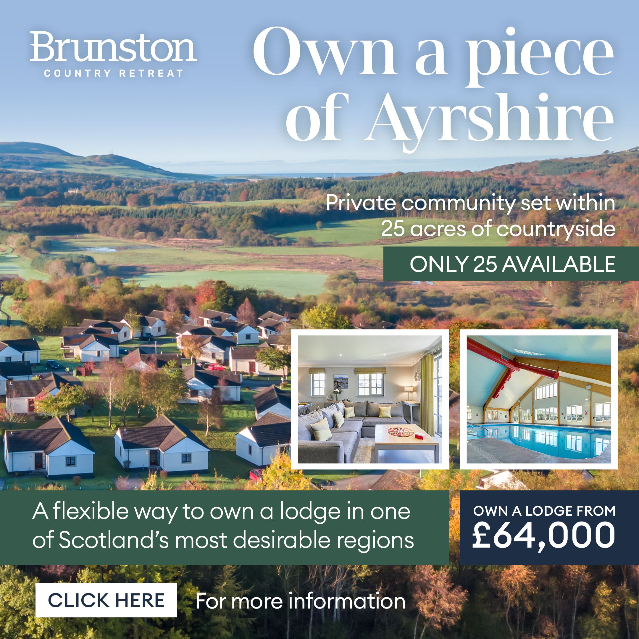 Scotland has a way of making people reconsider their priorities. Brunston Country Retreat sits in 25 acres of South Ayrshire countryside – freehold lodge ownership from £64,000, with 365-day use and net rental returns of up to 15% per year. A genuine second home to escape to in Ayrshire, with full resort amenities and the option to let it out and generate real income when you’re not there. Few investments come with countryside, community and a return worth talking about. Click here for more information.