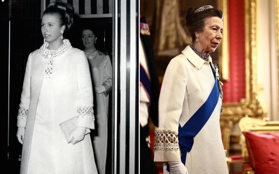 Princess Anne, for taking thriftiness to new levels by appearing at Wednesday’s state banquet for the Nigerian president in a white coat she first wore 57 years ago, when she was 18. It’s impressive not only that she held on to the garment for so long, unaltered but for a new collar, says The Daily Telegraph, but also that at 75 “she can still fit into an item created when she was a teenager”.
